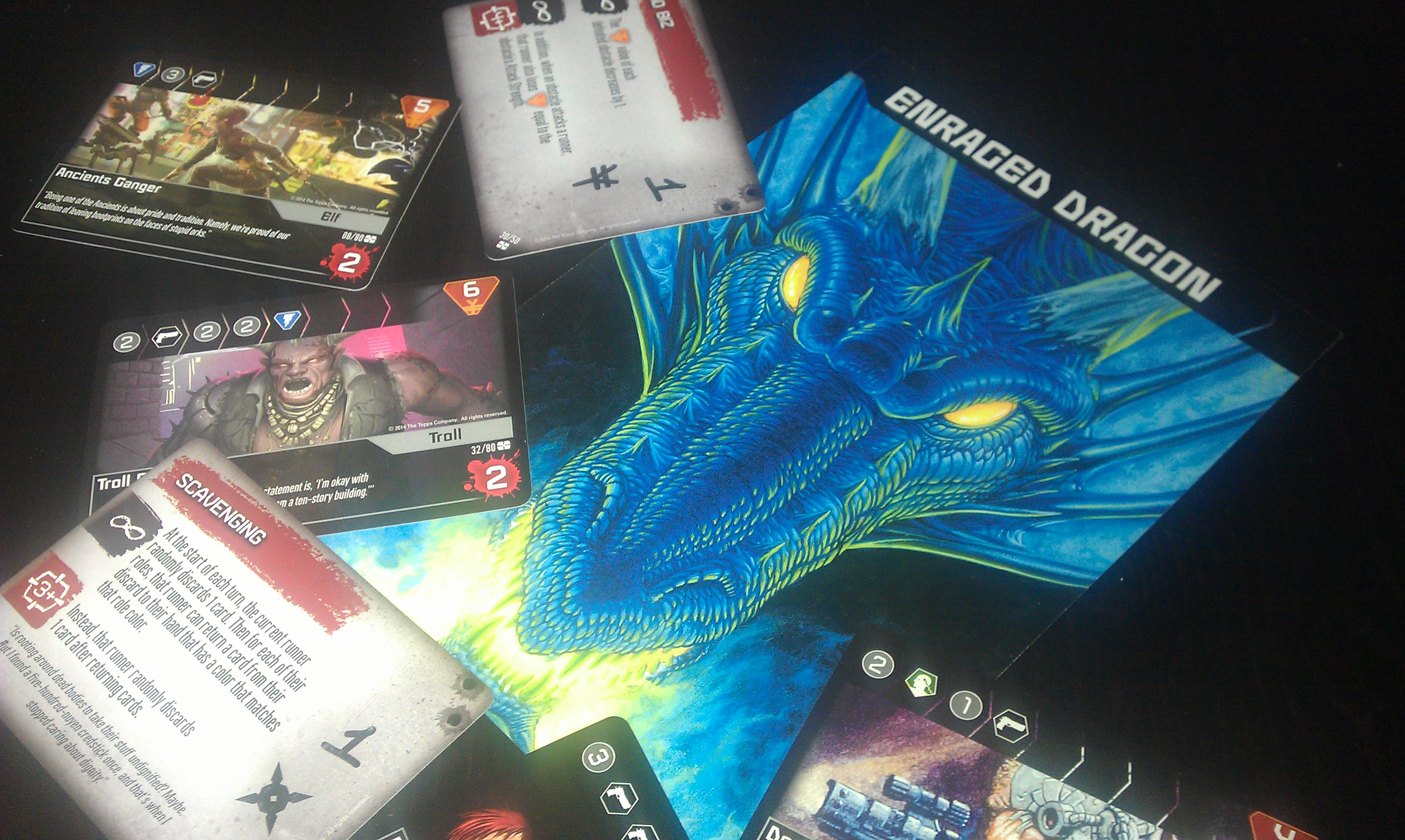 Un turno en Shadowrun: Crossfire consiste en jugar cartas sobre tus obstáculos o los de los demás, cobrar la recompensa por derrotar un obstáculo si se ha conseguido, recibir daño si no, robar un par de cartas si nos estamos quedando con la mano vacía y comprar alguna carta del «mercado negro» si podemos, añadiéndola a nuestra mano. Esto es un detalle que se agradece y parte de lo que hace de Shadowrun: Crossfire un juego de construcción de mazos un tanto atípico: durante toda la partida vas a comprar, como mucho, 5-6 cartas, y la chispa no está tanto en qué combinaciones locas consigas como en cómo y sobre qué obstáculos vas a jugar tus cartas ese turno.